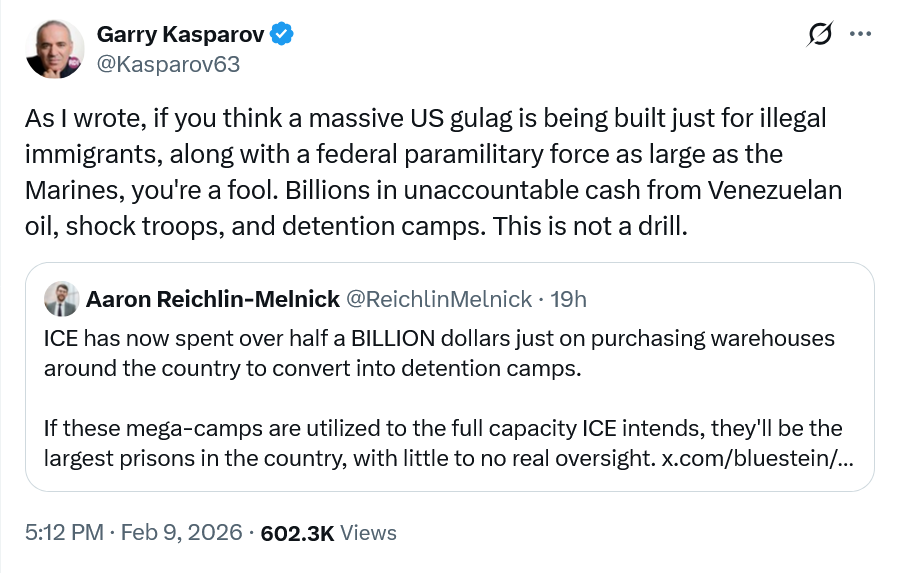 Blocking the expansion of these detention centers, and forcing ICE to stay focused on criminals and leave the rest of us alone (more here), has to be one of our highest priorities this year. For here’s what the famous Russian dissident Gary Kasparov shared last night: