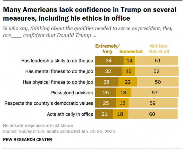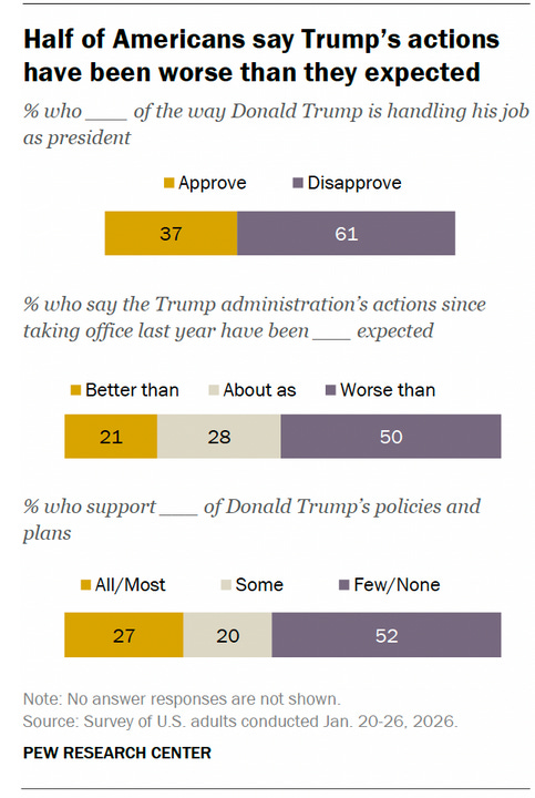 A new gold-standard Pew Research poll of over 8,000 adults has found tremendous erosion of Trump’s support and standing, even with Republicans, over the past year. Trump’s job approval in the first Pew poll of 2025 was 47%-51% (-4). Today it is 37%-61% (-24), a twenty point decline in just one year.