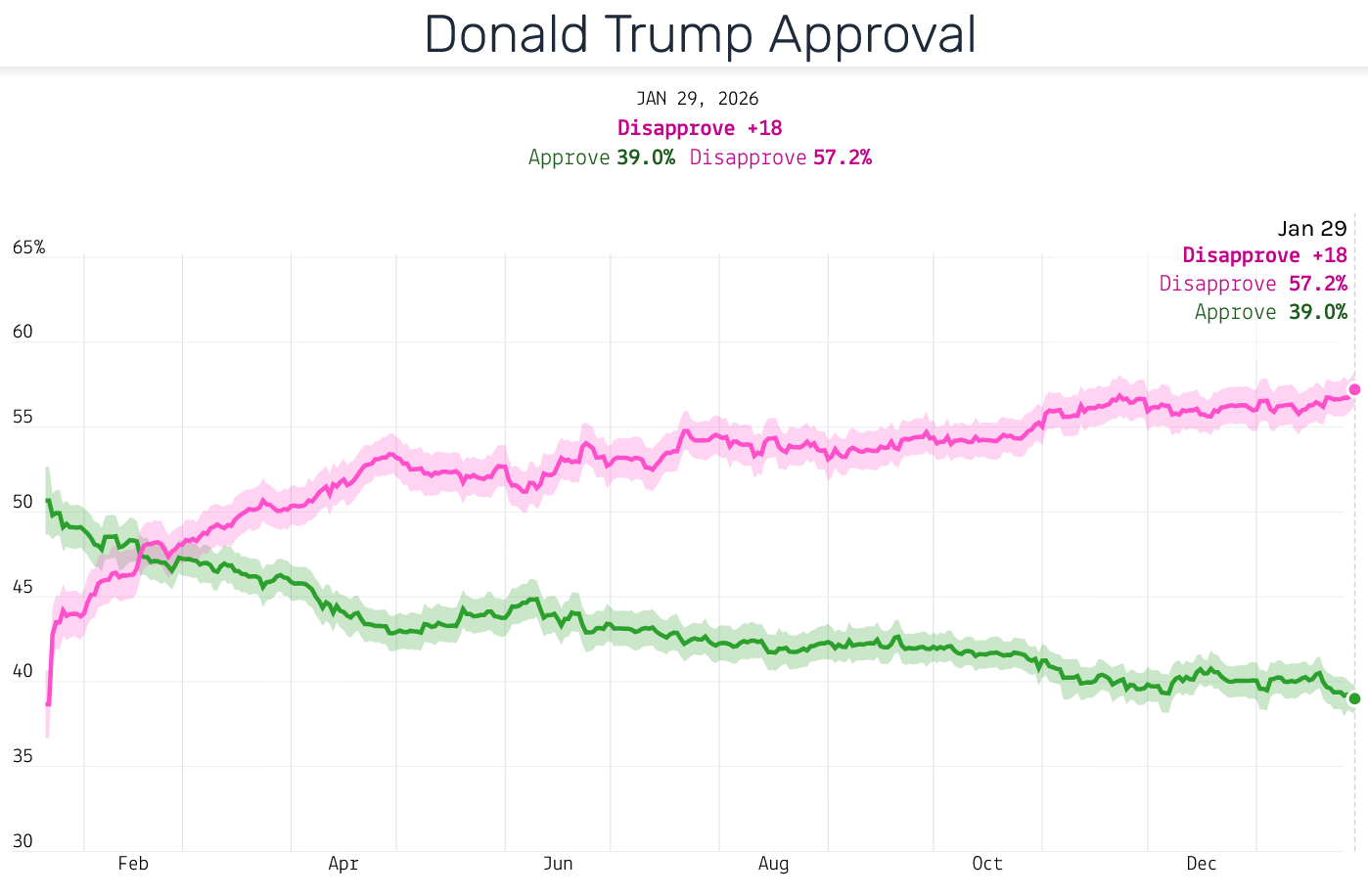 In the FiftyPlusOne polling average Trump has lost ground this week and is now for the first time this term at -18 in job approval. On September 30th, the last day before the shutdown last year, Trump was -12. He has lost six points net since then. It’s why the White House does not want another shutdown - for the last one weakened him, badly.