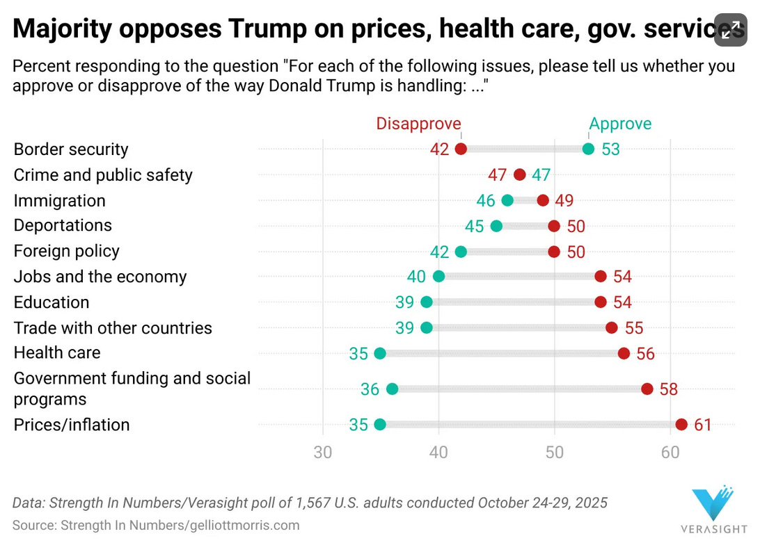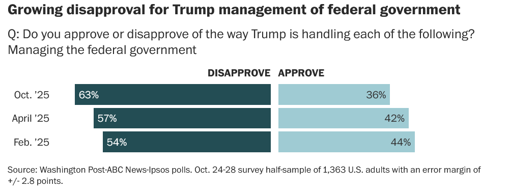 36% approve. Only 33% blame the Dems. It’s further evidence of the struggle a weakened and ailing Trump is having - despite their extraordinary information superiority - in rallying the country, and even his own voters, around him and his agenda. Trump’s ceiling has fallen and he is now showing up far more in the 30s/low 40s now than in the mid 40s/50s on the issues that matter to people.