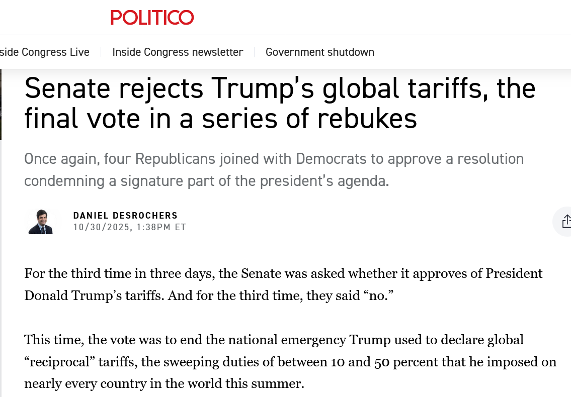 Yesterday the US Senate voted 51-47 to repeal Trump’s global “reciprocal” tariffs. It was the third time in the last three days the Senate had voted to end a piece of Trump’s destructive tariff regime. These three votes are, without question, the most significant Congressional break from Trump in his second term. As we discussed yesterday in my weekly video and written analysis little cracks can become bigger cracks, and this week we’ve seen significant cracks grow in his Congressional support in things that matter to him.