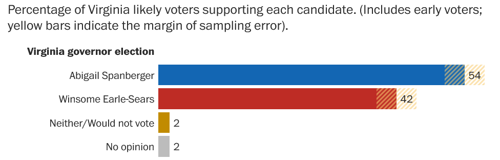 Lt. Gov candidate Ghazala Hashmi leads 51%-44% (+7) and the race for Attorney General between Democrat Jay Jones and Republican Jason Miyares is tied 46%-46%. While Spanberger has a strong lead in these closing days Jay Jones is going to need a strong Dem tide to win. So heads down all - keep working hard.