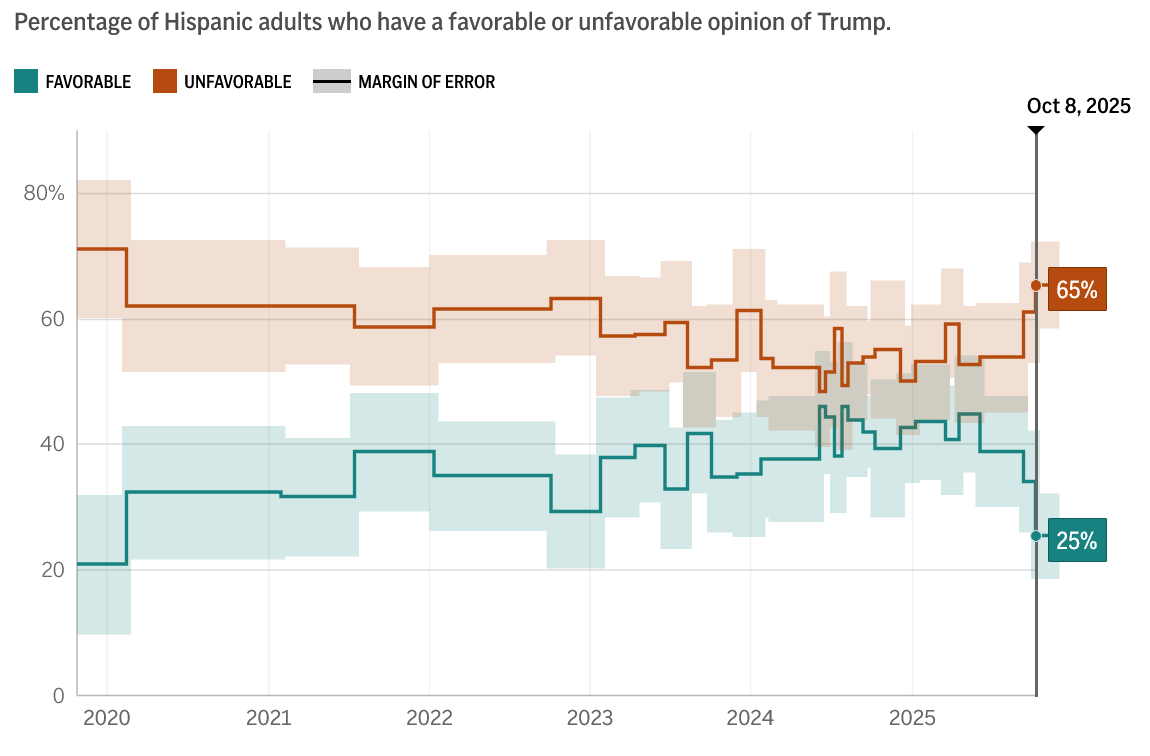 The October survey from The Associated Press-NORC Center for Public Affairs Research finds that 25% of Hispanic adults have a “somewhat” or “very” favorable view of Trump, down from 44% in an AP-NORC poll conducted just before the Republican took office for the second time. The percentage of Hispanic adults who say the country is going in the wrong direction has also increased slightly over the past few months, from 63% in March to 73% now.