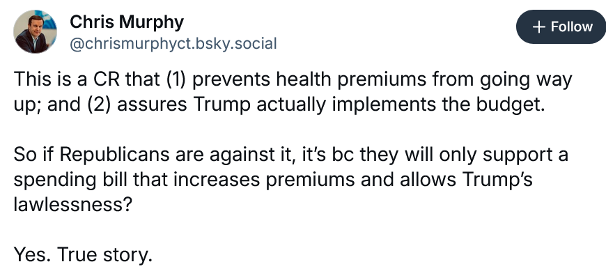 To be clear a week out there have been no negotiations between the Democrats and Republicans. Even though Trump and the Senate Rs need 60 votes to pass a budget that would require getting the vote of 7 Democrats, the Rs have been imperially unwilling to even sit down and talk to Democrats. What Democratic Leaders have asked for to pass a continuing resolution next week to keep the government open - not a budget, that comes later - is a repeal of the big ugly bill’s cuts to the ACA and Medicaid and a guarantee that the regime will follow the law and honor the budget as passed.