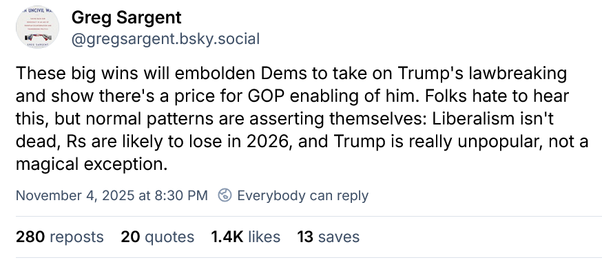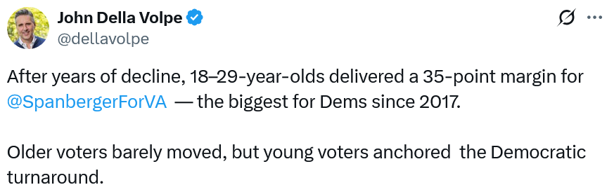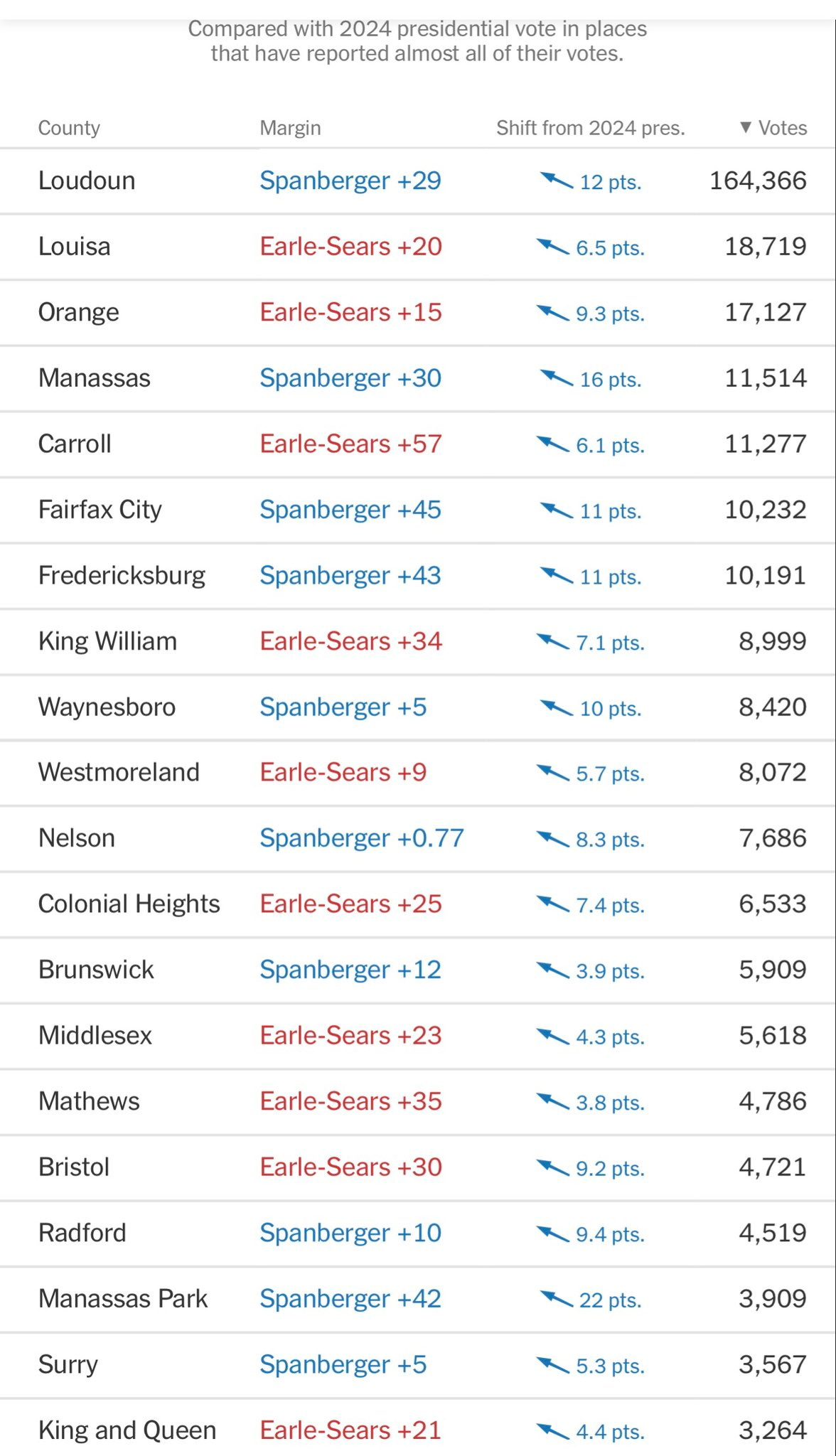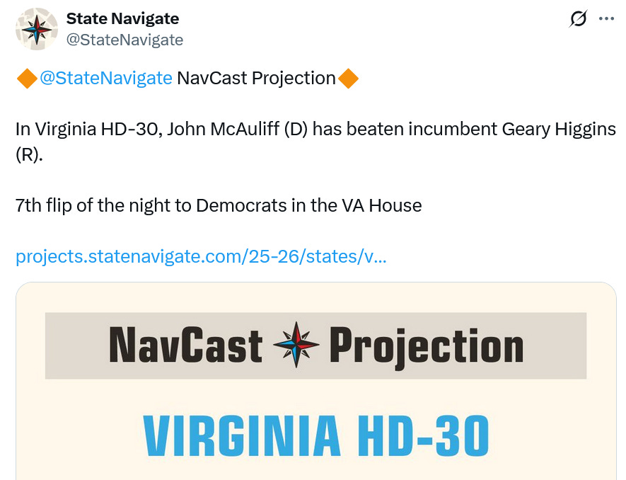 Several outlets have called the Virginia AG for Jay Jones, another flip. Fingers crossed. Democrat Ghazala Hashmi will be the Lt. Gov of Virginia, and the first Muslim ever elected to statewide office in American history.