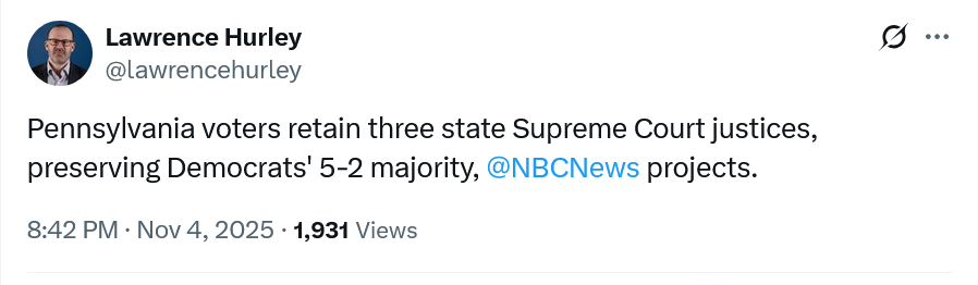 We retained all three Supreme Court Justices in Pennsylvania tonight. A big deal.