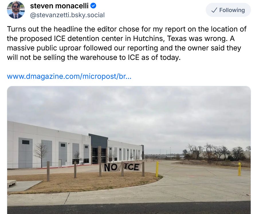 BREAKING: Company will not sell Hutchins warehouse to ICE.