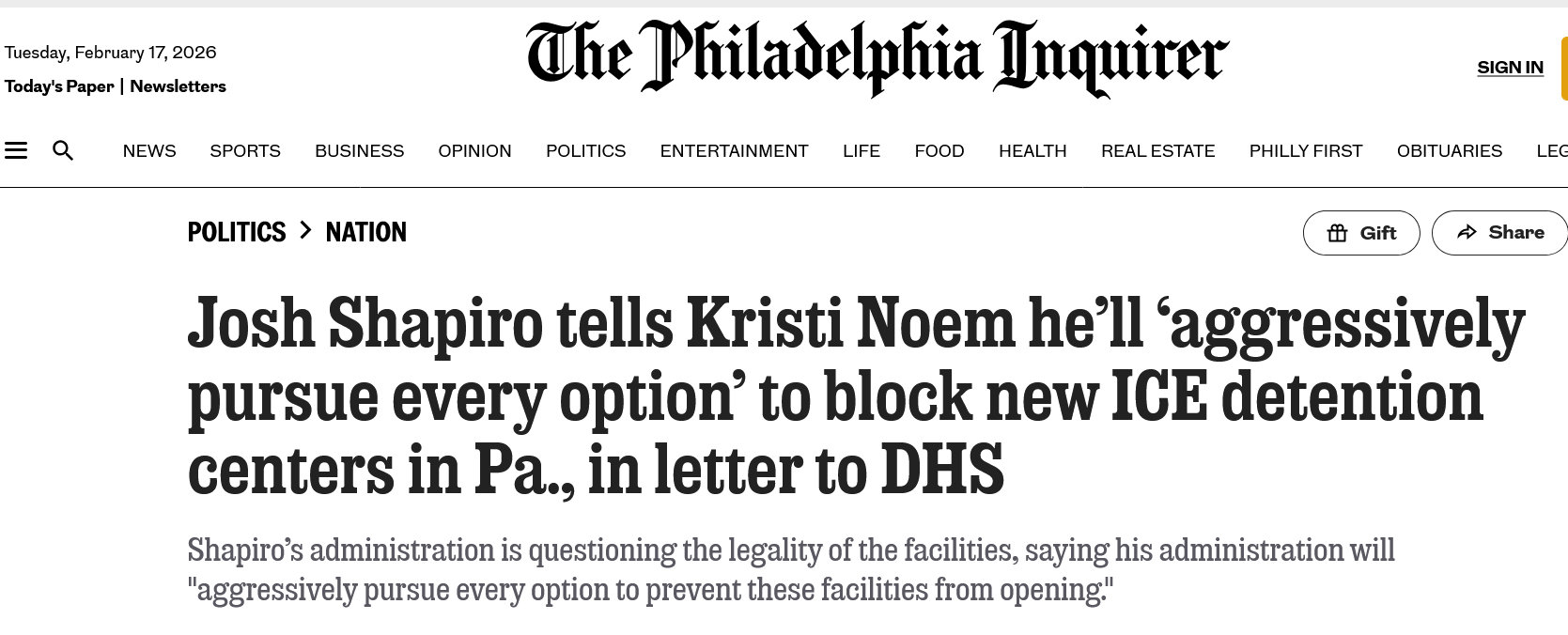 Late last week Governor Josh Shapiro sent a letter to DHS informing them that the state of Pennsylvania would do everything it could to block two detention camps planned for his state: