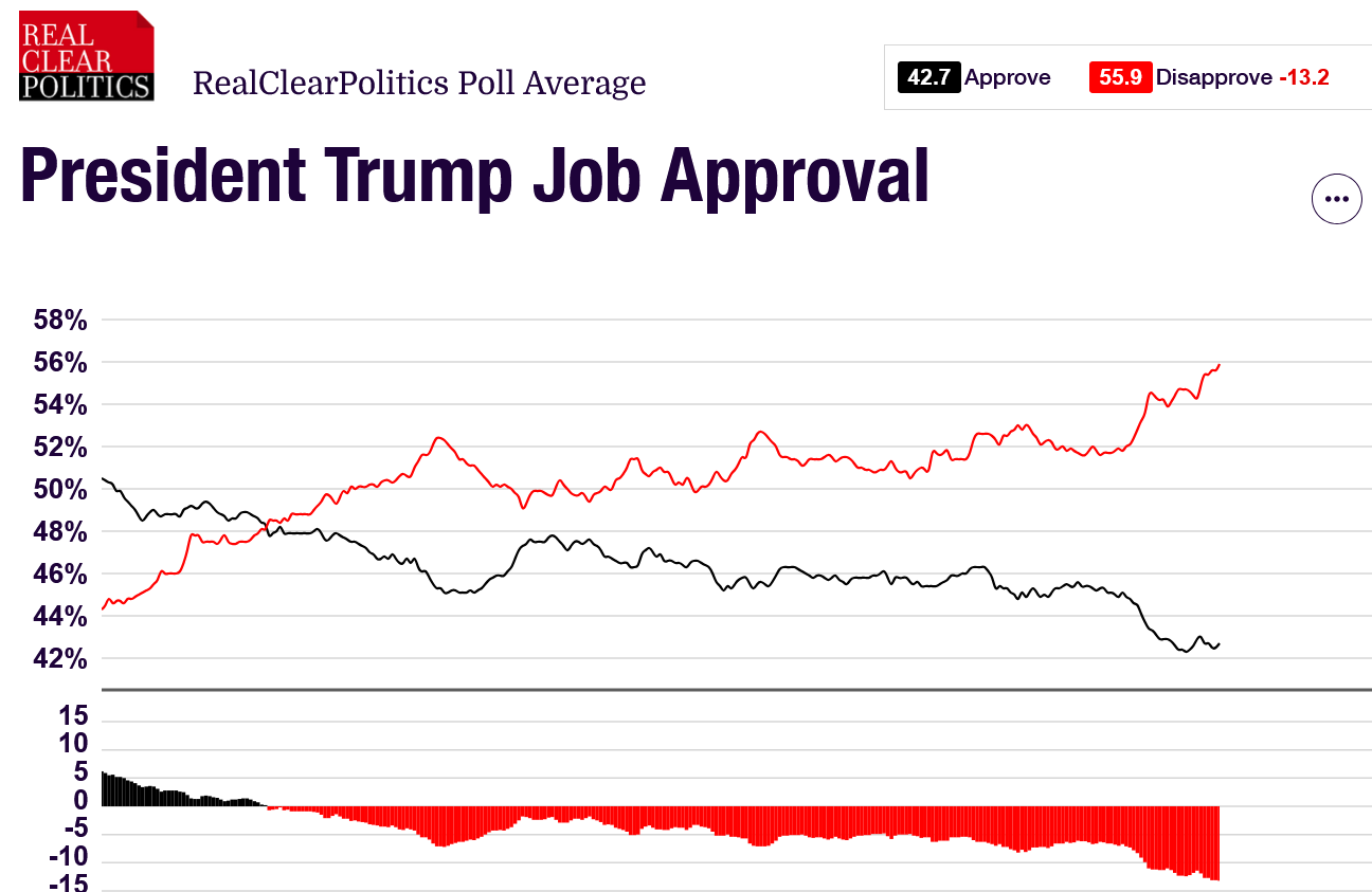 Look at what has happened to Trump’s job approval in the right-wing propaganda cite Real Clear Politics. In late October Trump’s job approval was -6 (while it was -13 on FiftyPlusOne). Everything was fine in MAGA world. Now look where it is, -13. Everything is all of a sudden very not fine, and the illusion of his strength has vanished.