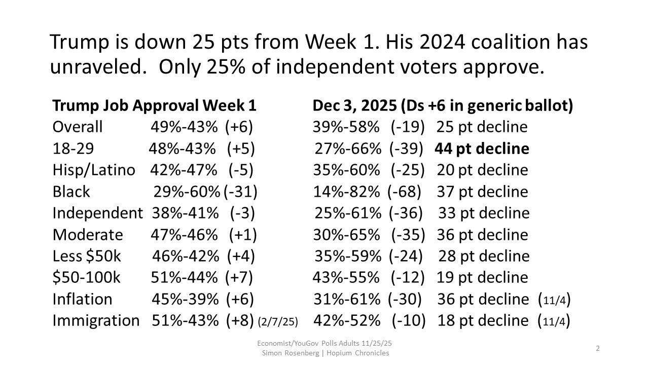 Things Are Likely To Get Worse For Trump and The Rs - The likely scenario next year is that things get worse for the Rs for two reasons: 1) conditions in the US will continue to erode 2) in a month every state and local government will start debating and legislating against the disaster Trump and the Rs have handed them - a slower economy (less revenue), huge health care and social safety net cuts, higher prices and weakened families, struggling small business and farmers, worker shortages and ICE abuses, higher utility prices, gutting of federal grants to large research institutions, etc…..