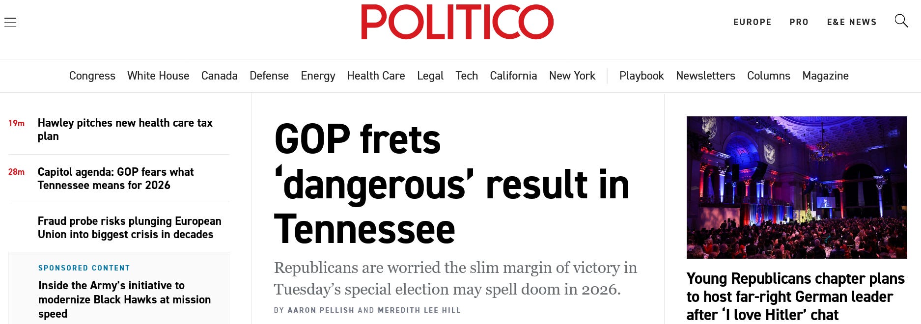 “Surprisingly tough Tennessee election reveals House GOP has base problem” - Washington Post