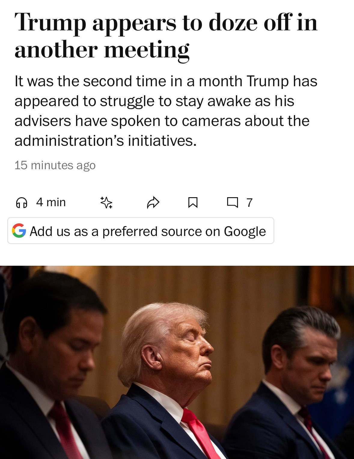 Trump fell asleep again yesterday, in the middle of the day, at an event he was hosting for the media, with lights blaring. Trump is struggling to do the very basics of the job now, and his very clear and public physical and cognitive decline must become front and center in our politics now (how can we trust him to protect us, make sound decisions, etc?).