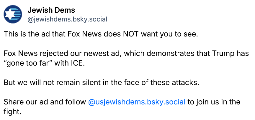 On Friday our friends at the Jewish Democratic Council of America learned that Fox News had refused to air an ad that’s part of a courageous new anti-ICE campaign they’ve launched: