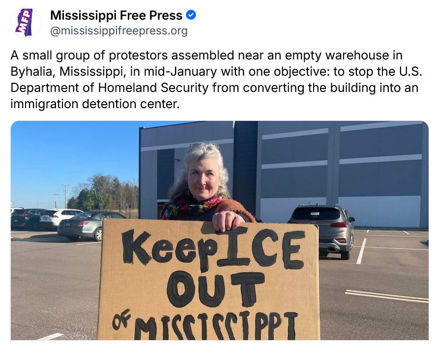 The Mississippi Free Press has terrific new reporting about local opposition to a planned ICE detention facility in Byhalia, a small Mississippi town. I am going to now post large portions of the article for it does a great job capturing how ill-considered and reckless this manic, inhumane, and unnecessary race to build these “detention centers” is: