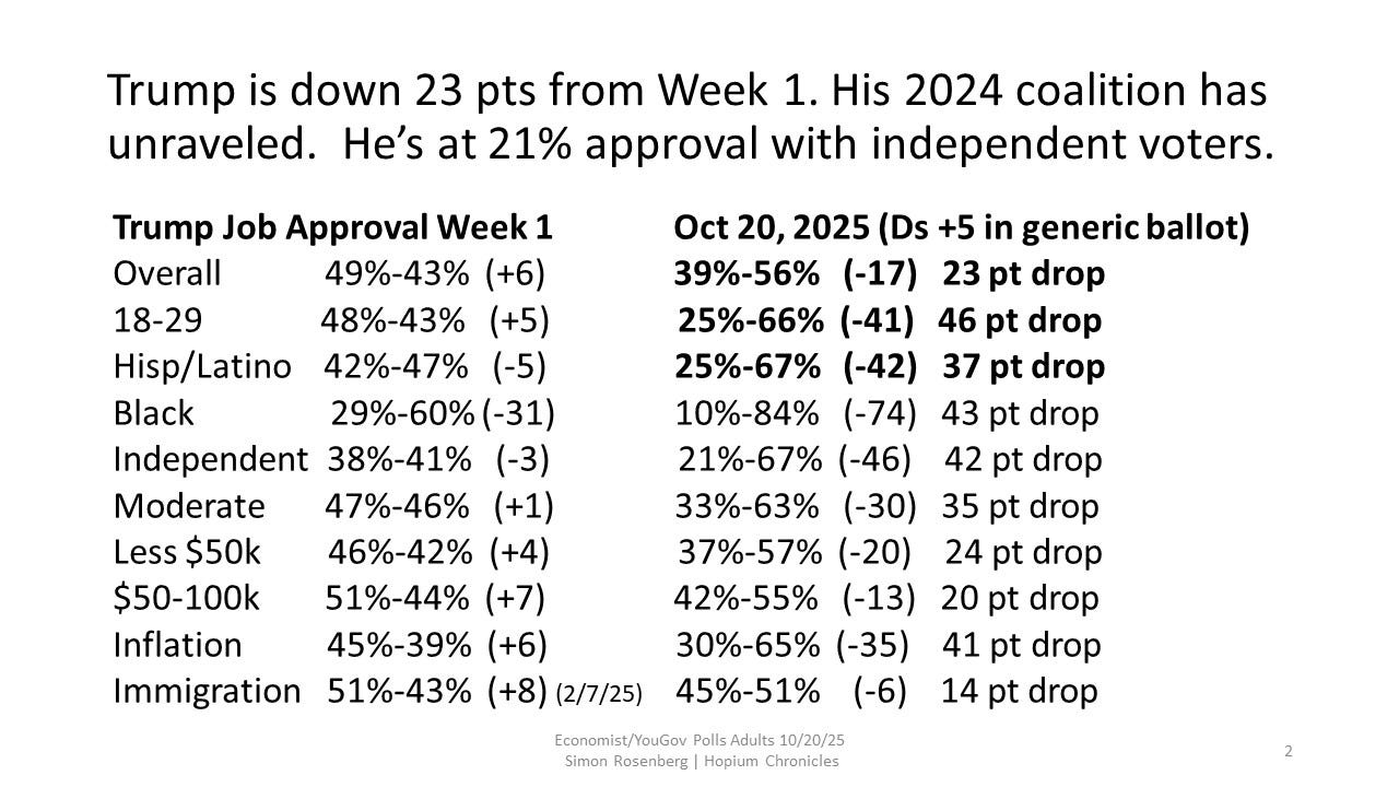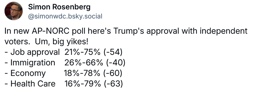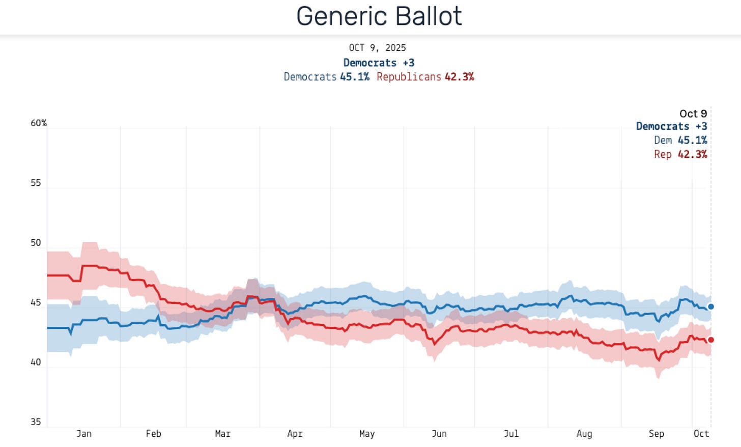 1) What this data shows is that the 2026 cycle can be one of our opportunity for us. Trump is a diminished figure, voters are unhappy with Republicans, and we are much stronger now than we were a year ago. If we work hard, and our candidates do their job, we can win this November and have a good mid-term next year. Can we flip both chambers? It will be hard, but as this data shows, not impossible.
