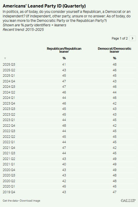 Here’s the new Gallup Party ID tracker. Dems have gained 11 points since the 4th quarter of last year and now lead by 7 points.