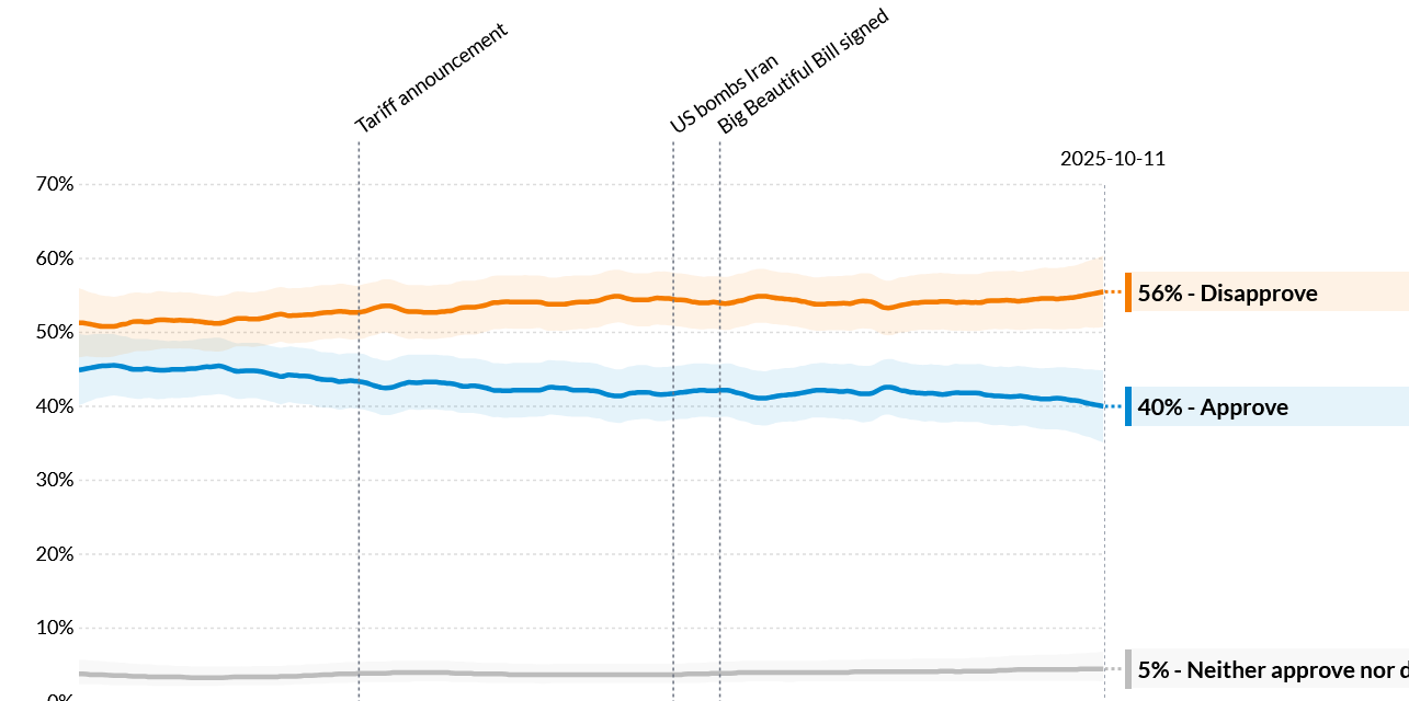 More Bad Polling For Trump. The Country Is Unhappy With Him And His Regime - Given Trump’s unpopularity, and that more Americans blame him and the Rs for the shutdown, there was always a chance that an extended shutdown could further damage his standing with the public. As I shared on Friday, most of the independent polls out this week showed him losing ground. This morning the Civiqs daily tracking poll, which had already dropped 2 points this week, dropped another 2, moving from 42%-54% earlier in the week to now 40%-56%. This is not just the worst result for Trump in this poll this year, it also by far and away his worst week.
