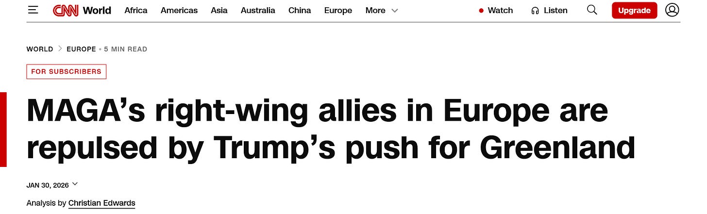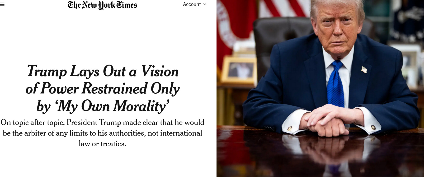 This NYT interview, and a similar one given by Stephen Miller on CNN that week, came in those heady days after Trump The MIGHTY and STRONG oversaw a midnight raid that seized Maduro in Caracas. In those heady and warm and lovely days Trump began his next adventure, a dramatic campaign to seize Greenland from the Europeans. And we know how that ended - Trumpian bluster was followed by Trumpian retreat as the Europeans banded together and demonstrated that indeed there were limits to his power other than his “own mind.”