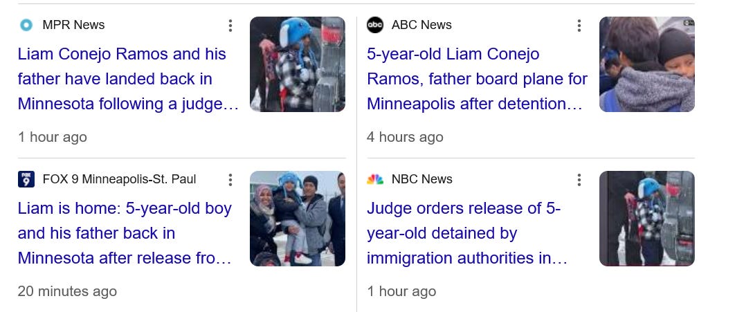 Liam Conejo Ramos and his father Adrián Alexander Conejo Arias are back in Minnesota in compliance with Judge Fred Biery's order!! https://www.mprnews.org/story/2026/02/01/liam-conejo-ramos-5-returned-to-minnesota-following-judges-order and as in the NYT gfit article I previously posted.