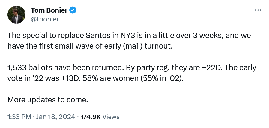 Tom Suozzi Leads In New Poll, Early Mail Ballots Are Promising - It’s not been a very good week for Republicans. First, the terrible turnout in Iowa. Next, Rs lost a house special they planned on keeping in Orlando. Then, the undiscplined and impulsive former President reminded us that a jury of his peers has already determined he raped E. Jean Carroll in a department store dressing room, and that he is the most unfit man to ever run for President; more good economic news just kept coming all week and the Rs case against Joe Biden just keeps melting away; their party splintered again over funding the government, and the new Speaker may already be in trouble; and now the Democrats come out of the gate strong in NY-3…..