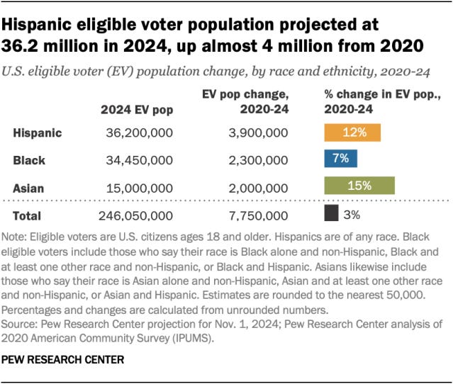 Pew Hispanic Releases New Data About The Hispanic Electorate - The Pew Hispanic center just released a new report, "Key Facts About Hispanic Eligable Voters in 2024.” The report is well worth reviewing. Two key charts: