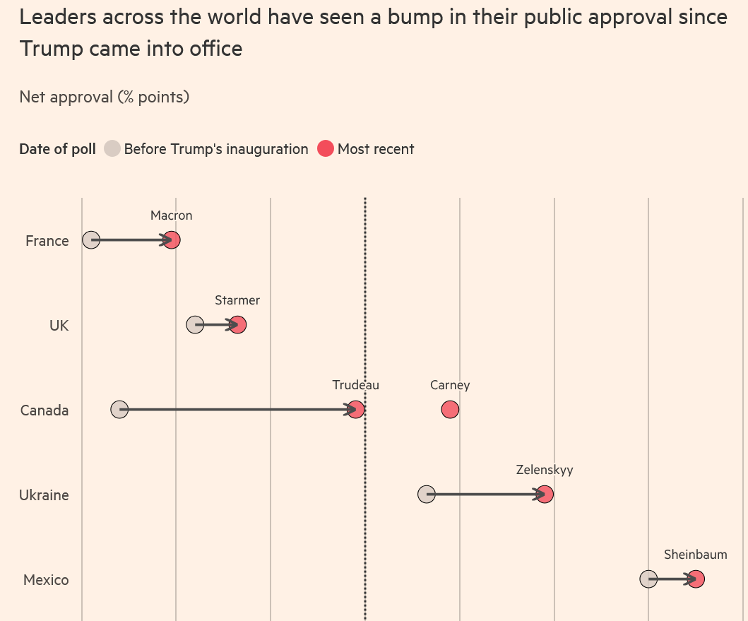 3 - The FT reports that global leaders who have challenged Trump has seen their approvals rise: