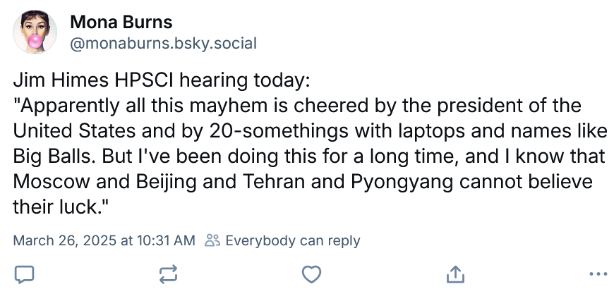 As I discuss below, I think we should be calling for both Hegseth and Gabbard to step down. Hegseth is obvious. He sent highly classified war plans on an insecure chat and simply can no longer be trusted. Gabbard for she is in charge of intelligence for the US, and must take responsibility for participating in and not stopping one of the most significant security breaches in US history.