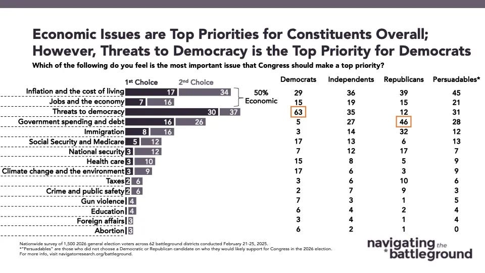 2- New Navigator polling finds that “threats to democracy” is now the #1 issue with Democratic voters, and tied as #1 with independents (yes there is reward in opening up that Second Front beyond the economy/budget/taxes):