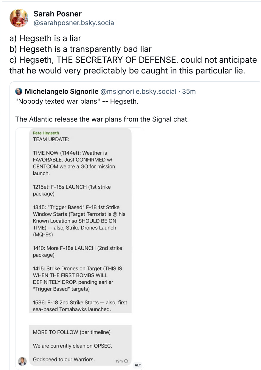 Breaking SignalGate News - They All Lied - This morning, predictably, The Atlantic released the battle plans our idiotic Defense Secretary shared over an insecure signal chat on Sunday, ones that he and the other members of the Trump Team said - in some cases under oath - were never sent nor secret. New, from Politico: