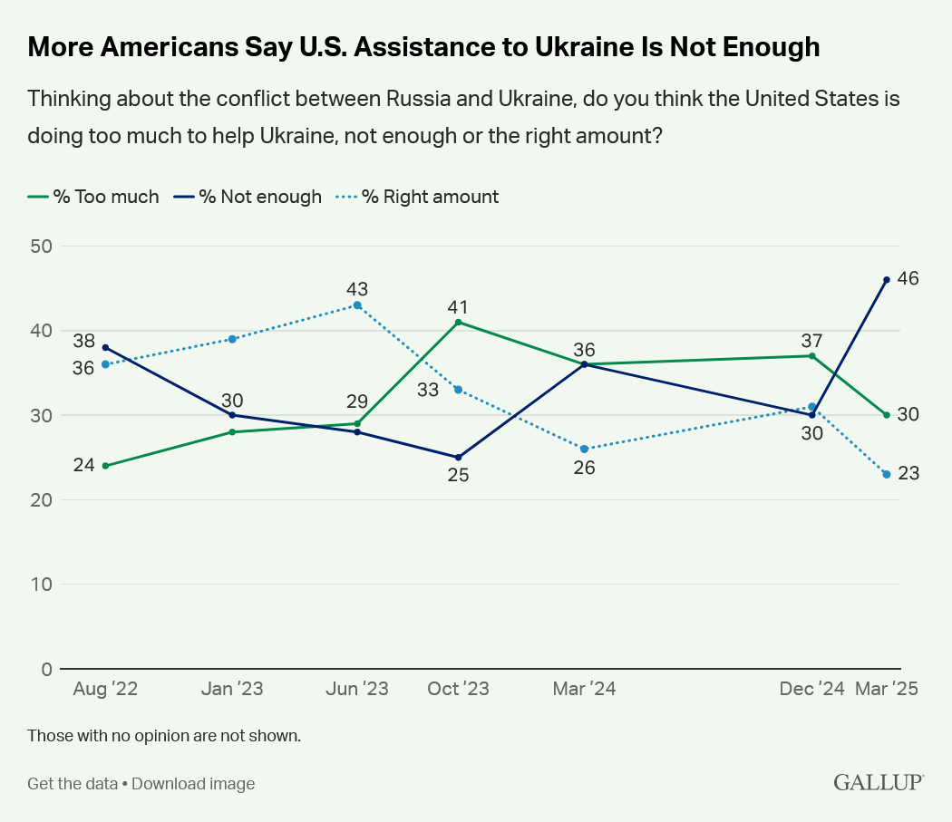 1 - A new Gallup poll finds support for doing more in Ukraine now at record levels (hard to imagine a more meaningful repudiation of Trump than this):