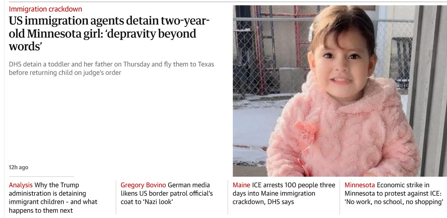 Here’s another story from the Star Tribune today that is worth our attention, and outrage. As DHS/ICE cannot work with state and local law enforcement due to their lawless tactics they are having to fly people they detain in Minnesota out of state to other detention facilities. Even children separated from their parents. And some of the people being shipped to these facilities are dying. This is a story of a 34 year old father of two in Minnesota who died EIGHT DAYS after arriving Texas. Imagine the terror this is bringing to targeted communities there. They get you and you can die.