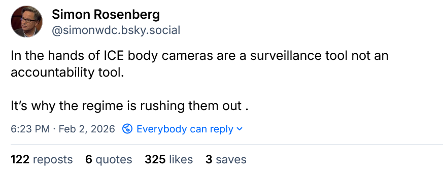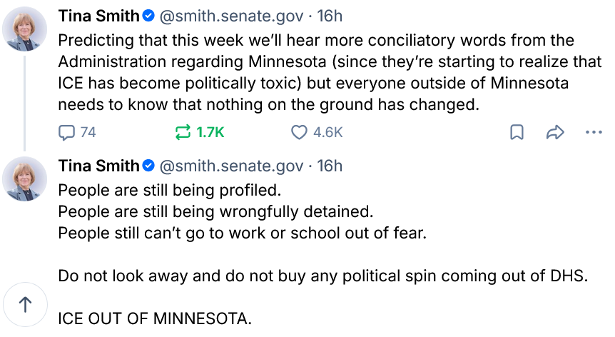 Please plan on making calls and contacting Congress today, and encourage any political groups you are part of - Indivisible, local Party, other grassroots groups - to join you. My recommended message is simple - ICE should leave Minnesota and follow the law, rather than break it. We want ICE to become a law enforcement agency rather than a lawless one. The Democrats are discussing true meaningful reforms (here) and once it is clear what’s in negotiating package we will lobby for that directly too.