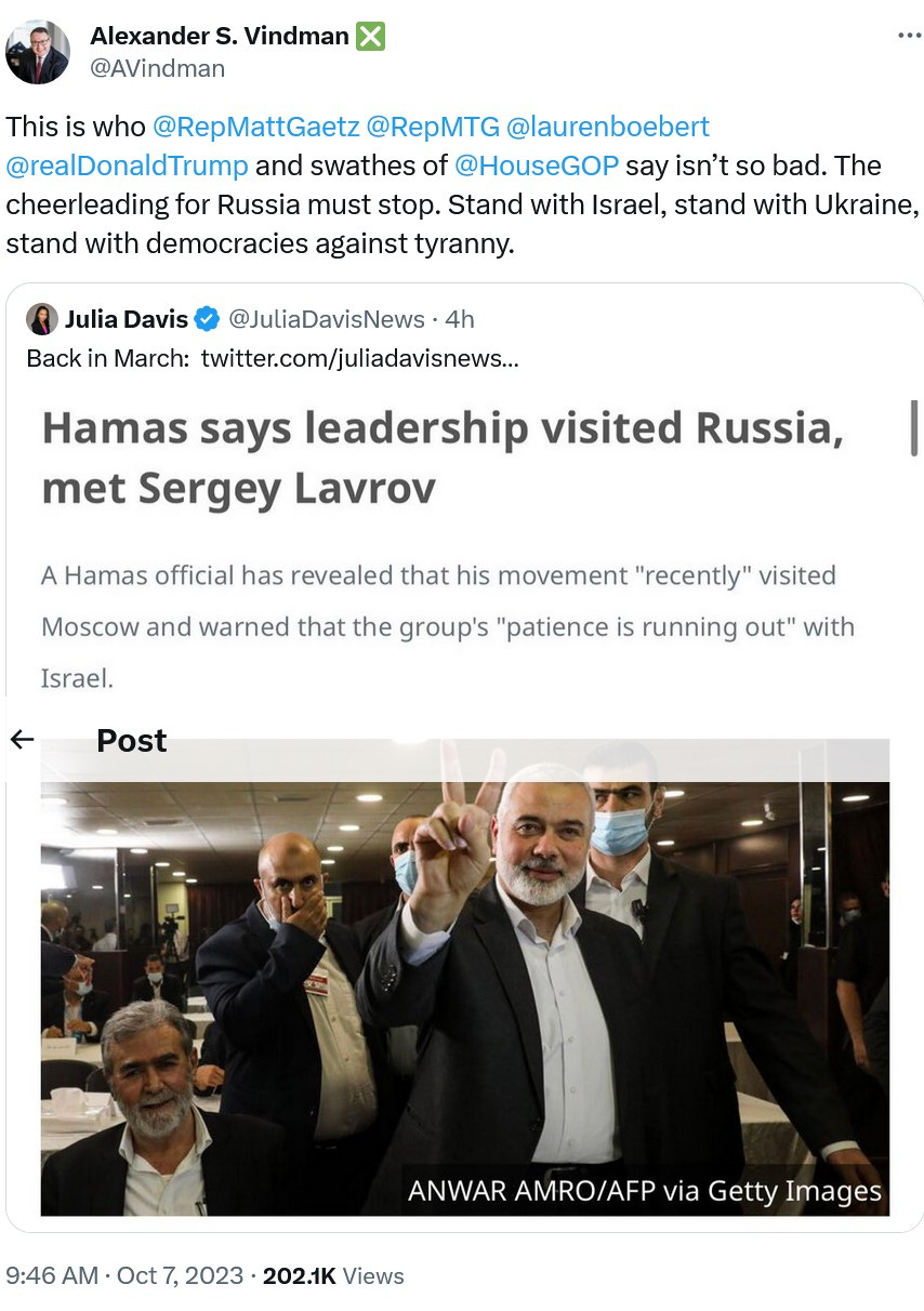Russian backed Hamas attacked Israel today. But of course if it becomes widely known here in the US that Russia helped support an attack on Israel support for funding the Ukraine war will rise, and those same Russian-loving Rs will be forced to back the Administration’s request for Ukraine funding. So predictably, and pathetically, using talking points which could have been written in Moscow, these Russian-loving Republicans are deflecting blame from Russia and somehow blaming Joe Biden and the United States for Hamas’ actions today.