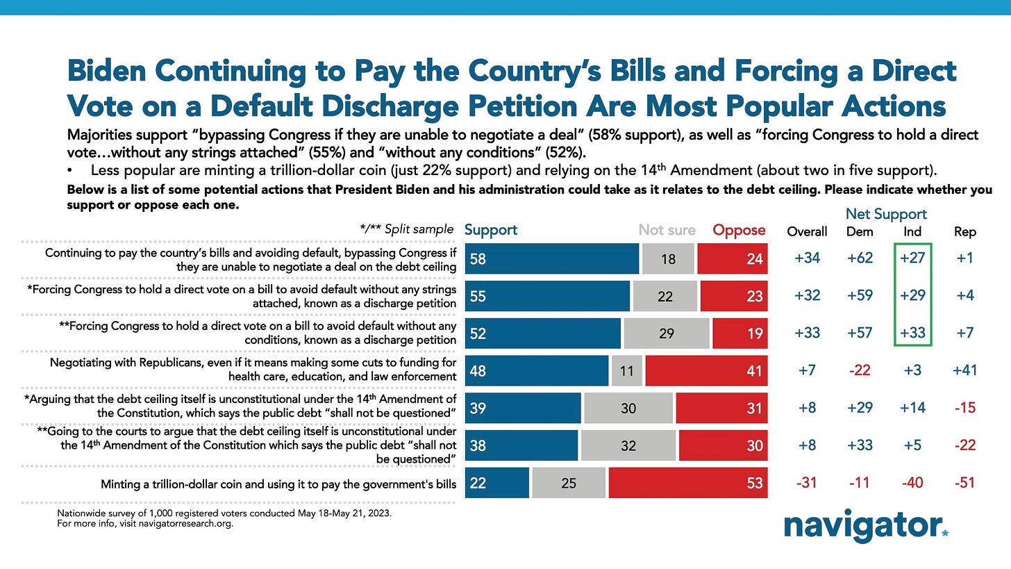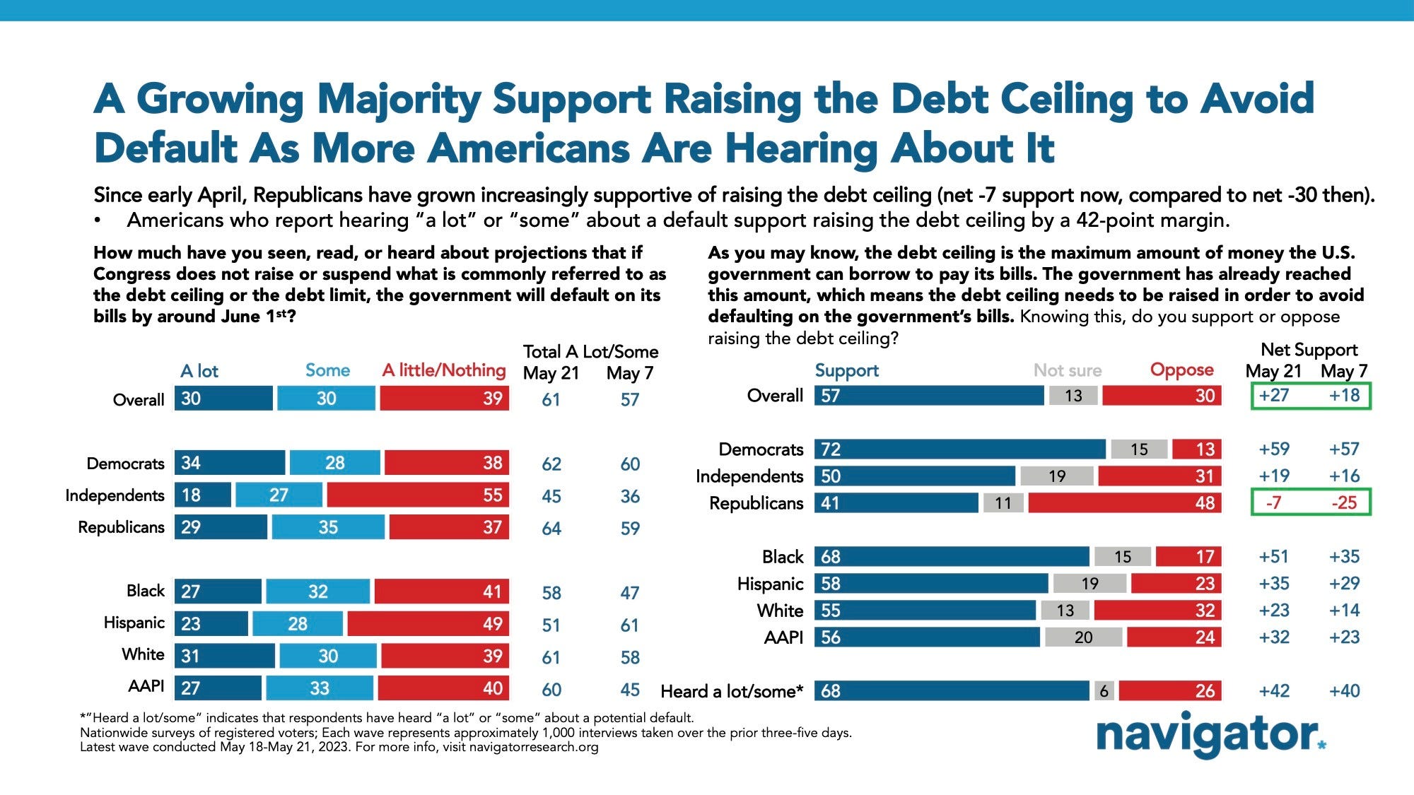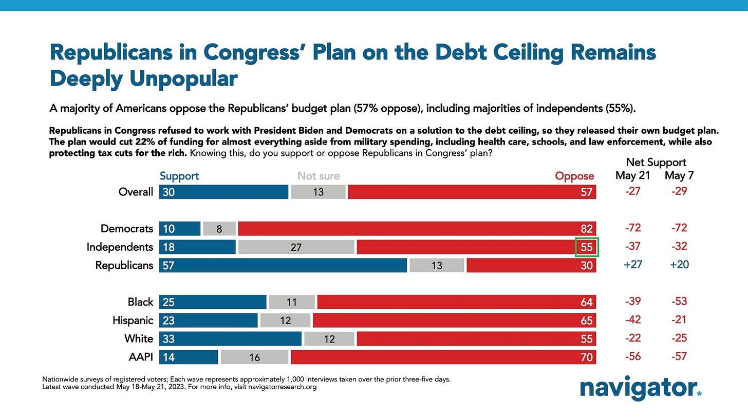 Here are a few charts from today’s Navigator poll on the debt ceiling. What they show is that Americans are basically in the right place here, but are not really paying close attention; Republicans are being given a bit more benefit of the doubt (as expected in any economic debate right now); but when voters are informed about what the Rs are actually proposing they recoil. It’s why we need to be loud here. Because we have a strong argument to make; not enough folks are hearing it; it works when folks do hear it; which is why we just need to keep our heads down and keep working it, together. We can do this.