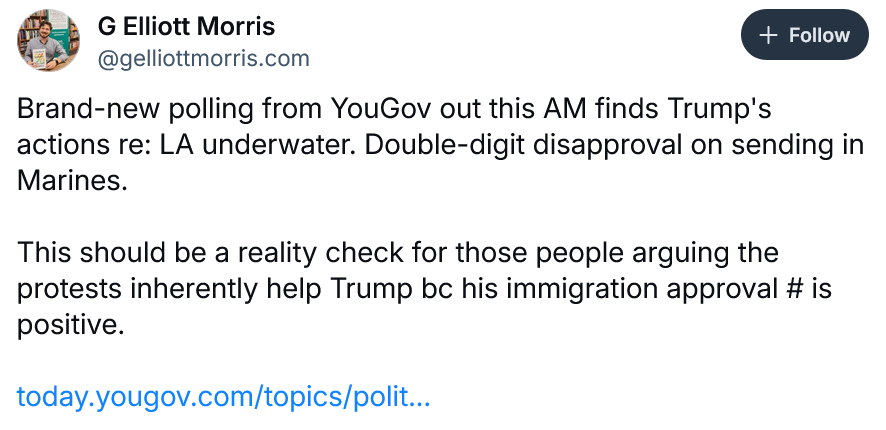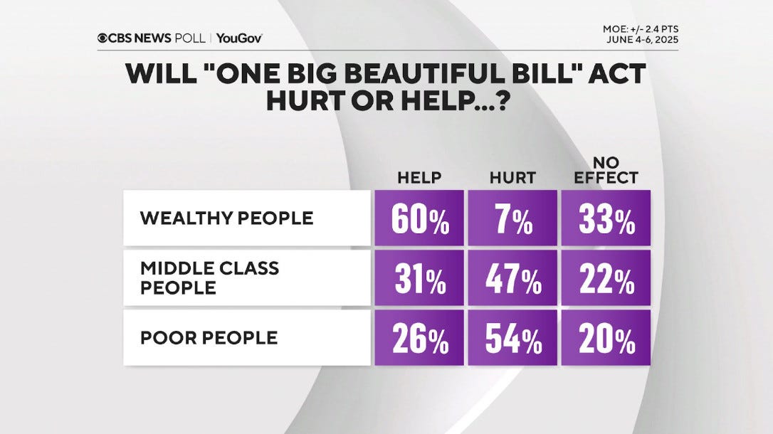 As I wrote to you a few days ago I remain convinced that this dramatic escalation in Los Angeles is coming in part to change the narrative of failure and struggle that took hold last week during Musk’s brutal emasculation of Trump (and perhaps Miller too). A Sunday CBS poll showed again how much the public has come to see the Trump budget bill (and his overall economic agenda) as good for the wealthy and bad for everyone else. Trump and the Republicans have lost the argument on this terrible bill, badly, and it is a very big problem for them.