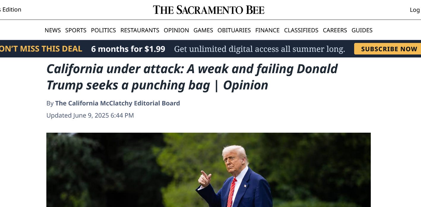 Read this remarkable editorial from the editorial board of McClatchy media in California: California under attack: a weak and failing Donald Trump seeks a punching bag