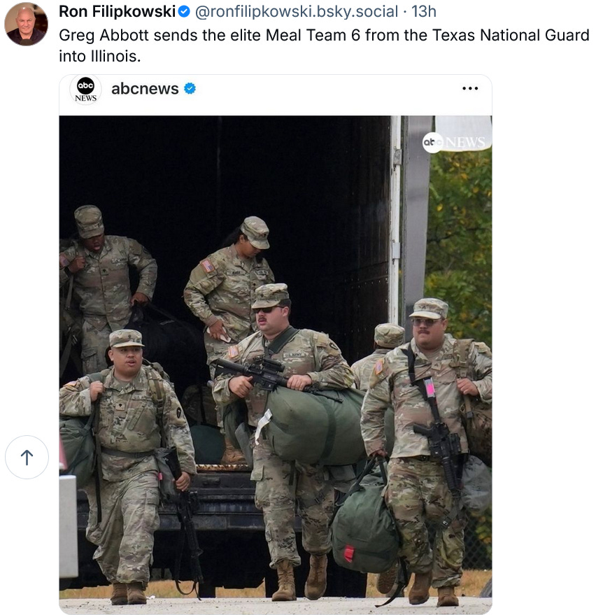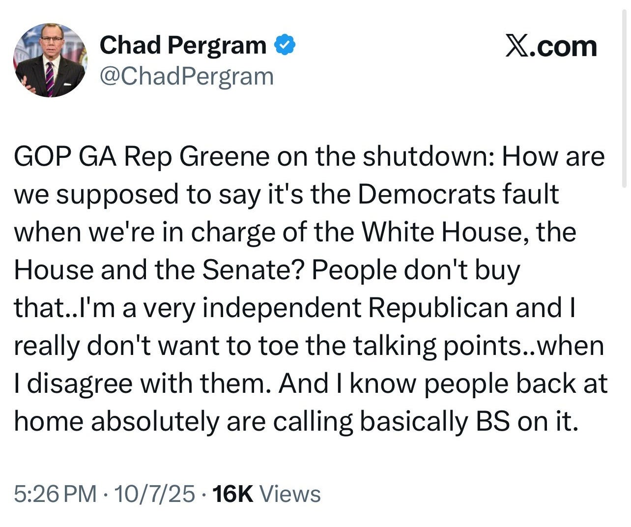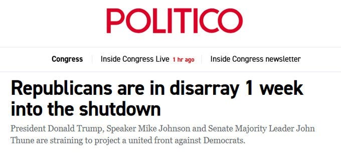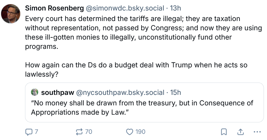 Meanwhile there are no budget negotiations happening. The Republicans don’t even have a process to create a budget - one that was supposed to be in place on September 30th - let alone a budget for Democrats to negotiate over. Since Mike Johnson lost that first vote on releasing the Epstein files back in late July the House has only been in session for two weeks and no work has been done on creating a final budget - again one that was required by law to be in place on September 30th. Sensing how they’ve lost control over the process and are losing the big arguments the White House has lost it’s shit, childishly threatening or announcing desperate and often lawless actions actions - insurrection act! Refuse back pay for government workers! Prosecute Comey! Punish blue states! Start paying bills by stealing tariff revenue! - that are making it far harder to ever get to a deal with Democrats (or even perhaps Republicans). The entire budget process, one proscribed by our Constitution, has completely broken down…….