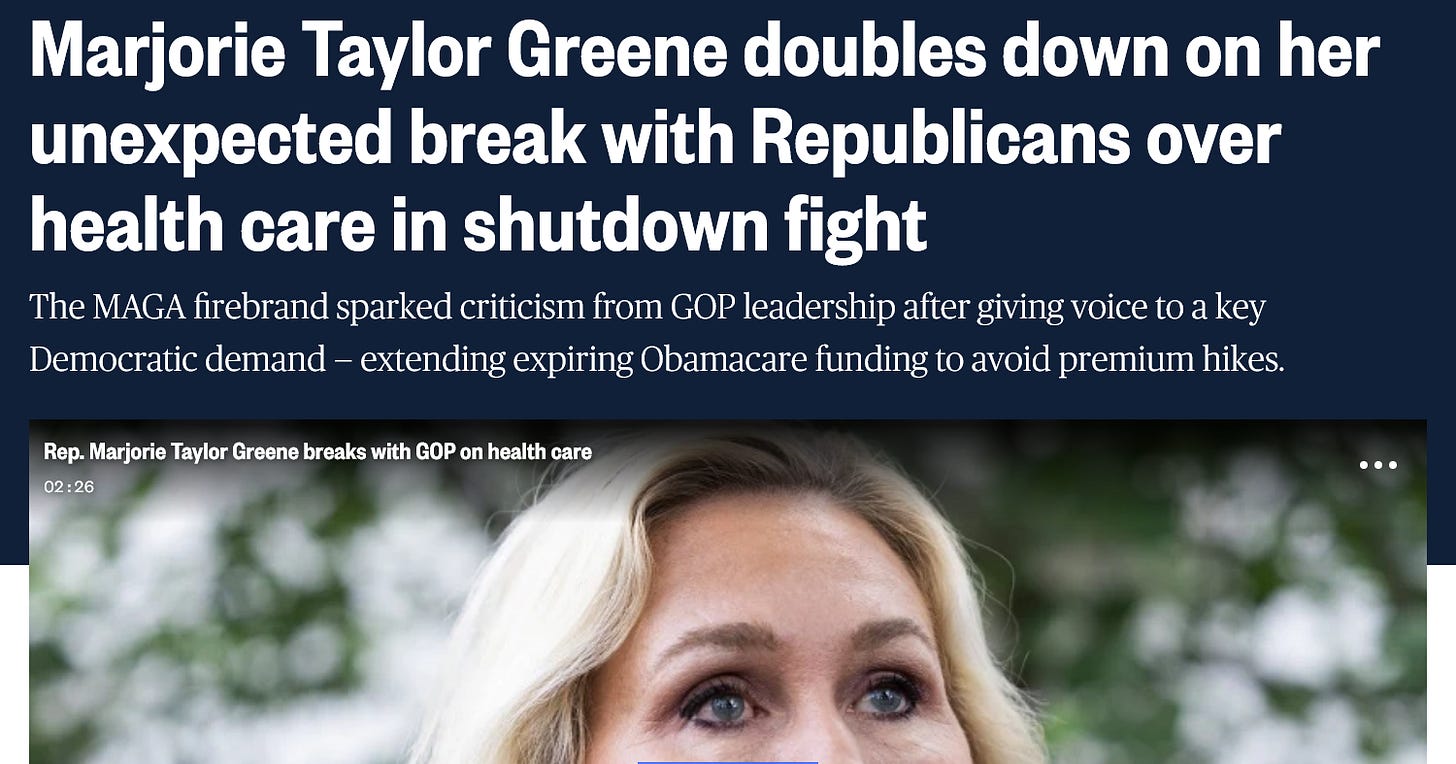 The big ugly bill was wildly unpopular. Trump is wildly unpopular. The tariffs are wildly unpopular. The masked men and military on the streets are wildly unpopular. The gutting of our health care system and unraveling of our vaccine regime is wildly unpopular. And they are going to put all of this - all of it - into a single year end budget bill and keep everyone in line, when they are breaking now on Epstein and the ACA subsidies? Maybe, but just hard to see how that happens.