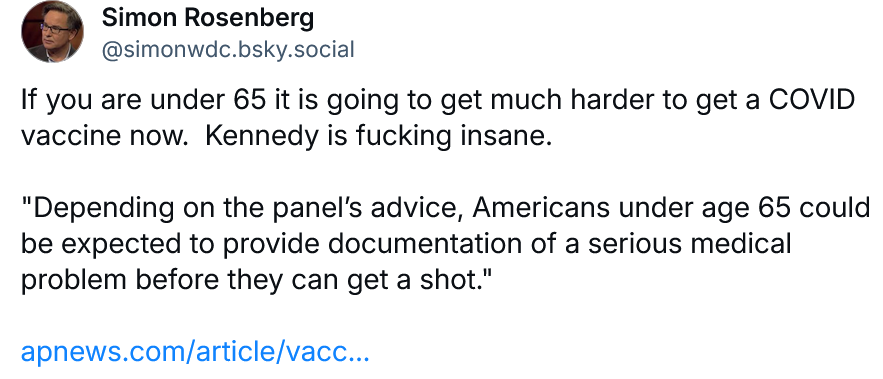 The second is the public resignation letter of Dr. Demetre C. Daskalakis, Director of the National Center for Immunization and Respiratory Diseases at the CDC, one of the several prominent CDC officials to resign today. It comes hours after the Trump Administration announced that the COVID vaccine was no longer going to be readily available to most Americans under the age of 65.