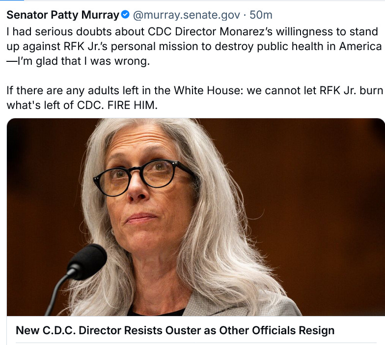 All hell broke loose at the CDC and HHS late this afternoon. As this is an evolving story I won’t go into detail beyond the gift link of the NYT article, above, and we will have time to dive into it all tomorrow. I don’t write to you in the evening very often but as fighting Trump’s destructive war on science, higher education and public health has been one of our highest priorities, I wanted to send along two remarkable things in this vital struggle that caught my attention tonight.