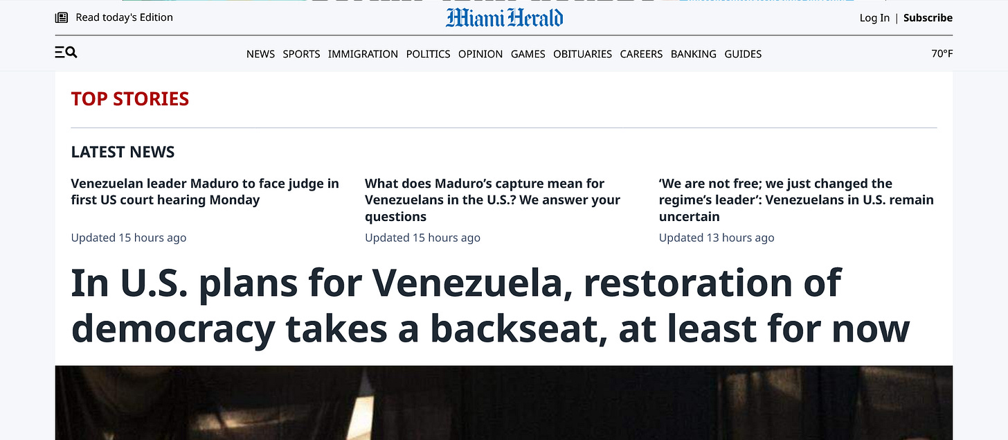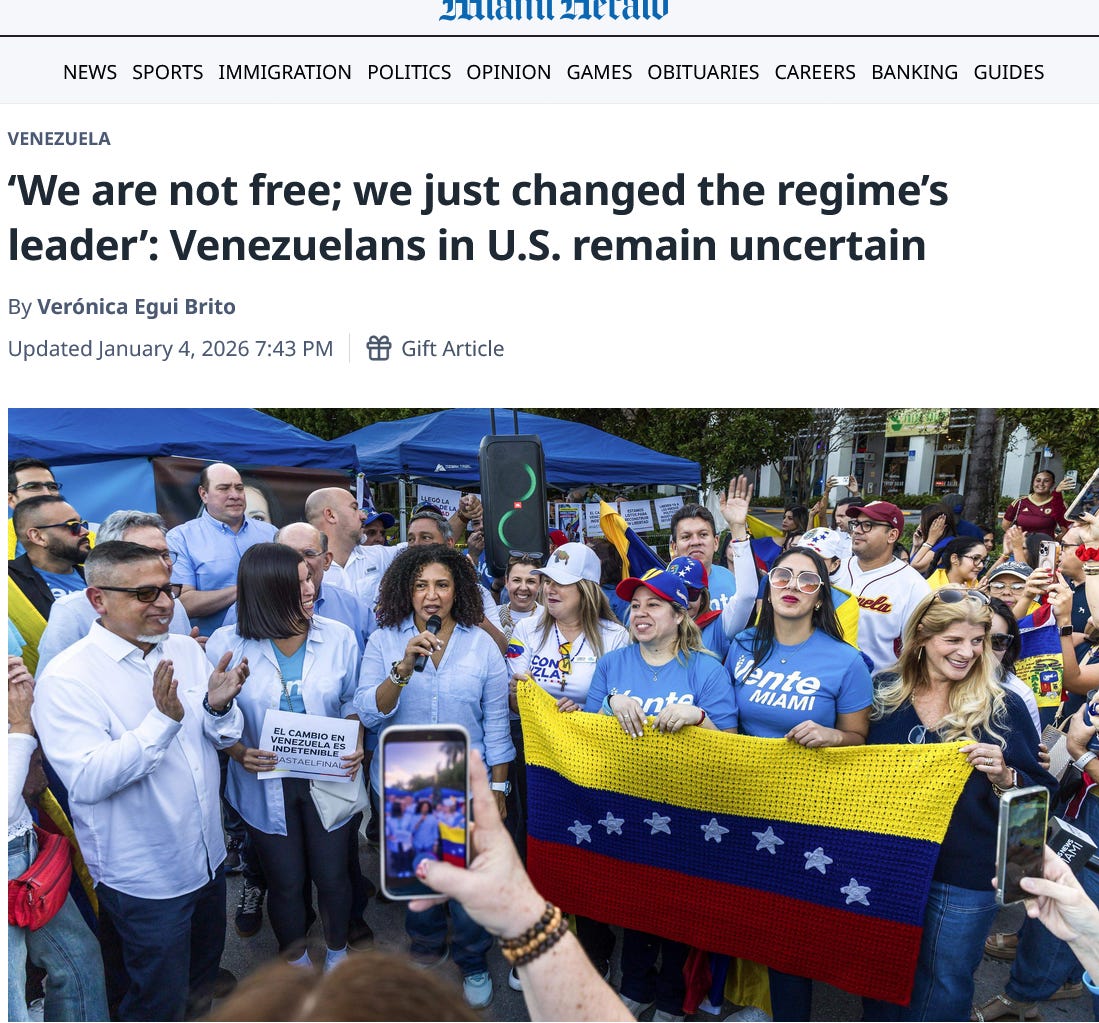 After initial elation Venezuelan emigres in the US are starting to wonder whether their nation is actually being liberated. An excerpt from this front-page Miami Herald story cited above: