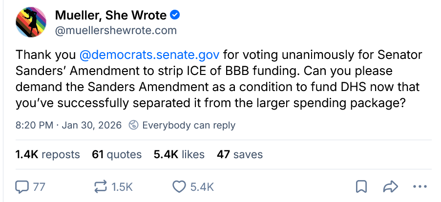 The Senate Democrats were successful in forcing the regime and Congressional Republicans into a sustained debate now about these incredibly dangerous, inhumane, and unpopular policies. We need to approach these next few weeks with confidence that we have the country behind us and must do everything we can to stop where we all know this is headed. We must rein in DHS and ICE, but we must also work to roll back the additional DHS funding from the big ugly bill - it is an extraordinary waste of money, equal to two years - yes two years of the ACA subsidies that Republicans refused to extend. For as I’ve been saying 2026 is a year for us to win the mid-terms but also a year for us to become far more effective at reining in Trump-Vance-Miller and stopping our accelerating slide into autocracy.