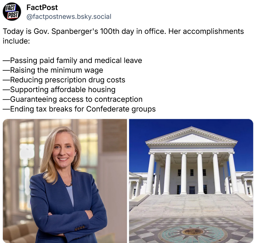 Thanks, Simon, especially for the uplifting look at Gov. Spanberger's first 100 days. (Also, I admit to being tickled to learn that the WH wants nothing to do with former Gov. Youngkin, who was hoping for a position there. Hopefully, that creep is done.)