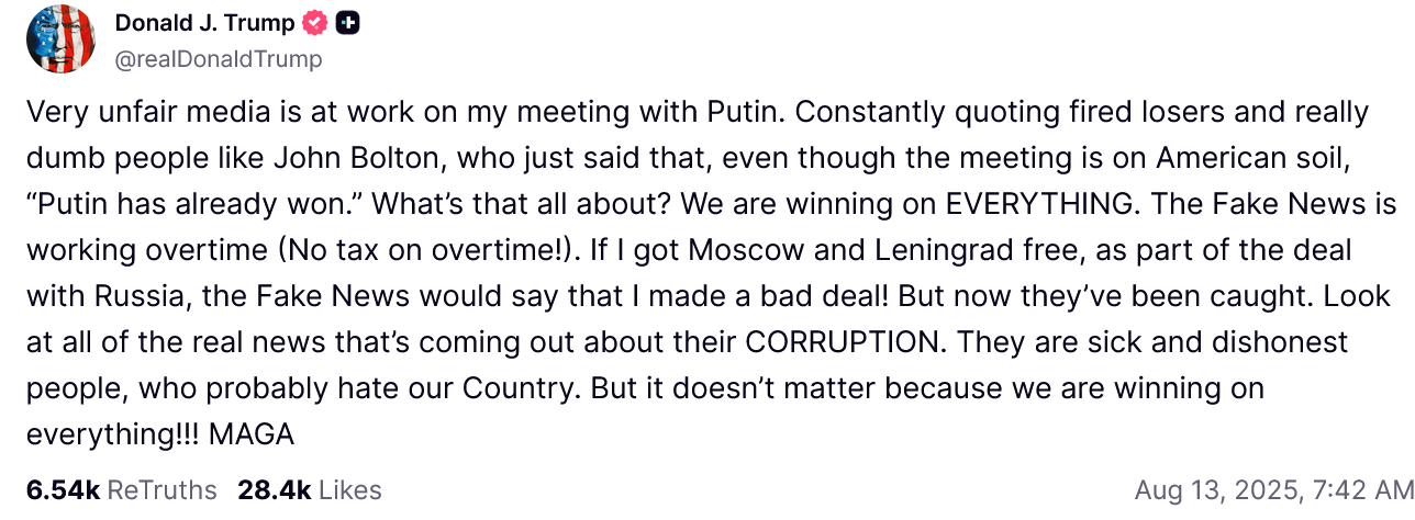 Like his deployment of troops to DC based on fictions and lies, mistakenly agreeing to allow Putin to come to the US and embarrass us on the world stage would be in any other time grounds for removal from office. Trump is so manifestly unfit now - old, addled, unhealthy, failing, wildly impulsive, unpopular, autocratic - that it has become a charade to pretend otherwise.