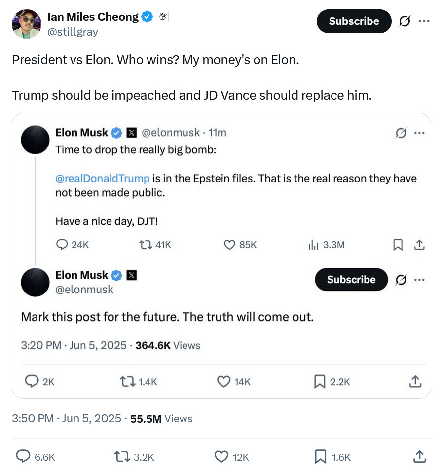 Six months and four days in it’s clear Trump is in trouble. This period of unraveling began with Elon’s three day long assault on Trump in early June that included this tweet: