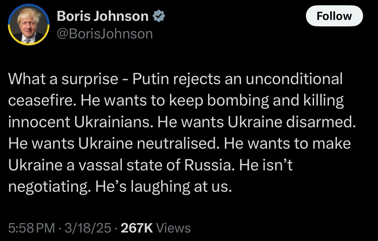 We are going to go into more detail about this in the coming days but I am now declaring Trump’s Ukraine strategy to be the single greatest foreign policy failure in our history, a geopolitical catastrophe for America and the free world. In recent weeks Trump has torched our alliances and for all intents and purposes left NATO, acts that leave America far more exposed and vulnerable to a hostile attack than we’ve been in generations; he’s made extraordinary concessions to Putin only to have Putin show up an hour late for their call yesterday and then to basically throw Trump into the corner like a ragdoll. Due to Trump’s idiocy and/or fealty to Putin, America has gotten nothing in return for all these unilateral concessions we are making to Russia including the incredibly unconstitutional and illegal elimination of our global pro-democracy communications channels and the ending of USAID. As a result Putin is far stronger today, Trump/America/The West is far weaker and a global war on the European continent far more likely. To repeat - Trump’s Ukraine strategy has been a world-altering catastrophe for the United States of America. America IS NOT WINNING under Trump.