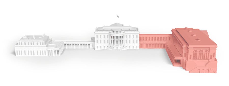 Morning all. It has a been a week, hasn’t it? One of the ugliest in this terribly ugly era of Trump, the sequel. The Washington Post has an incredible story this morning, “How Trump’s ballroom will dwarf the White House” (gift link) that shows how enormous - and completely out of proportion - this monstrous new imperial ballroom will be. Here is one of the renderings from the story: