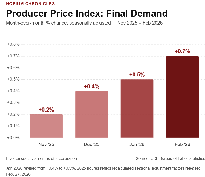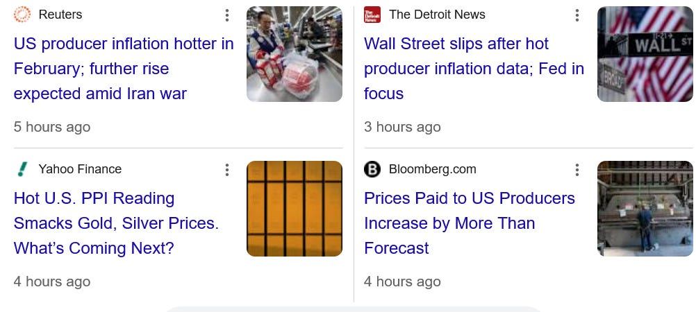 Friends, we got another bad economic report this morning - one of the three main inflation gauges, the Producer Price Index, came in way above expectations in February. Here’s CNBC: