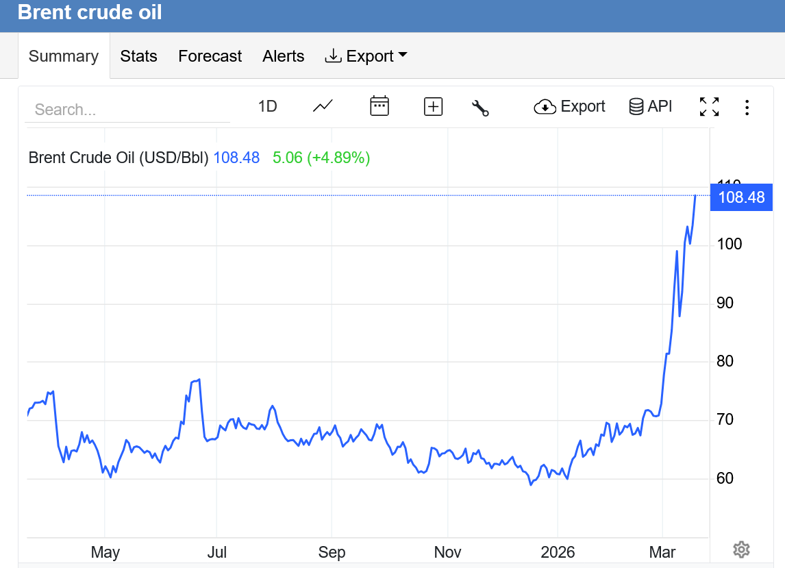 Again, all this data is from before the war. Here’s Brent crude at press time - up today to $108 a barrel: