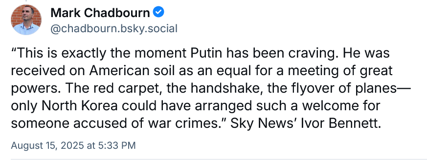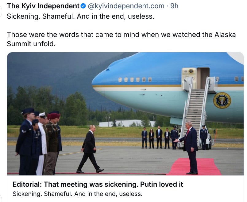 Morning all. Yes, it was as horrible as we all feared. Trump literally rolls out the red carpet for Putin on American soil and not only does he get nothing in return, but yesterday our weak, cowardly and corrupt leader broke with Ukraine and the Europeans/NATO and adopted Putin’s position on the conflict, folding like a cheap suit.